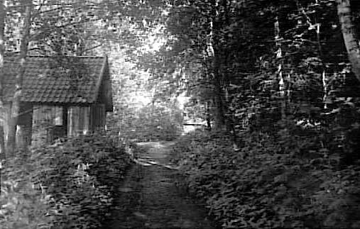 VÄG GENOM SKOGSPARTI TILL HÖGER EN LITEN BYGGNAD