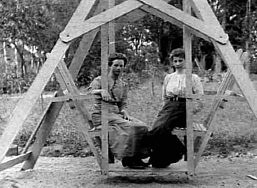 TVÅ KVINNOR I EN TRÄDGÅRDSGUNGA.
