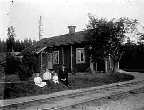 FAMILJ SOM SITTER FRAMFÖR BANVAKTSTUGA NÄRA JÄRNVÄGSSPÅRET