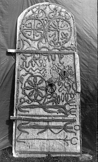 Den gamla kyrkdörren av ek, med järnbeslag.