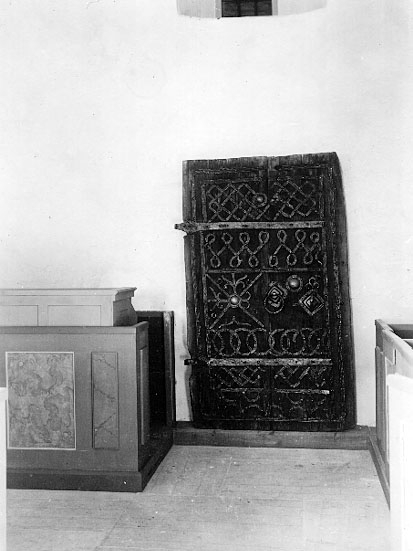 Gamla ytterdörren uppställd mot västra innerväggen efter restaureringen 1941.