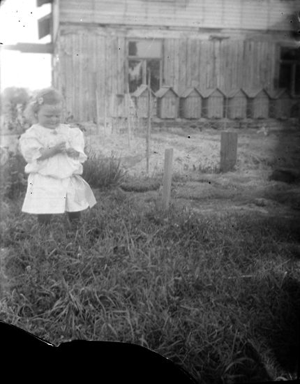 Vitklädd flicka framför hus och bikupor.
