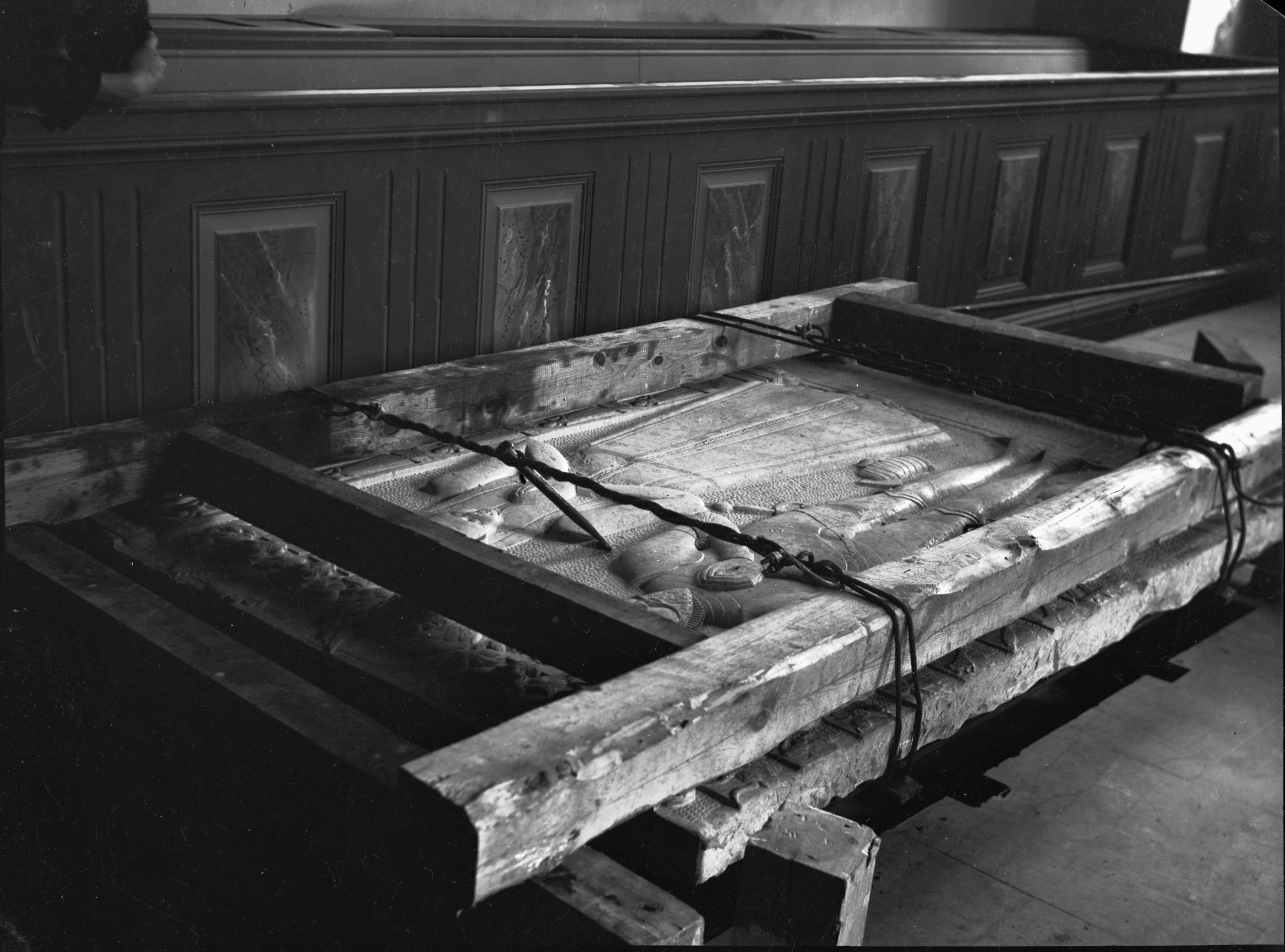 Lockhäll över ingången till Oxenstiernska gravkoret i form av reliefbilder av sandsten över Axel Oxenstiernas föräldrar.