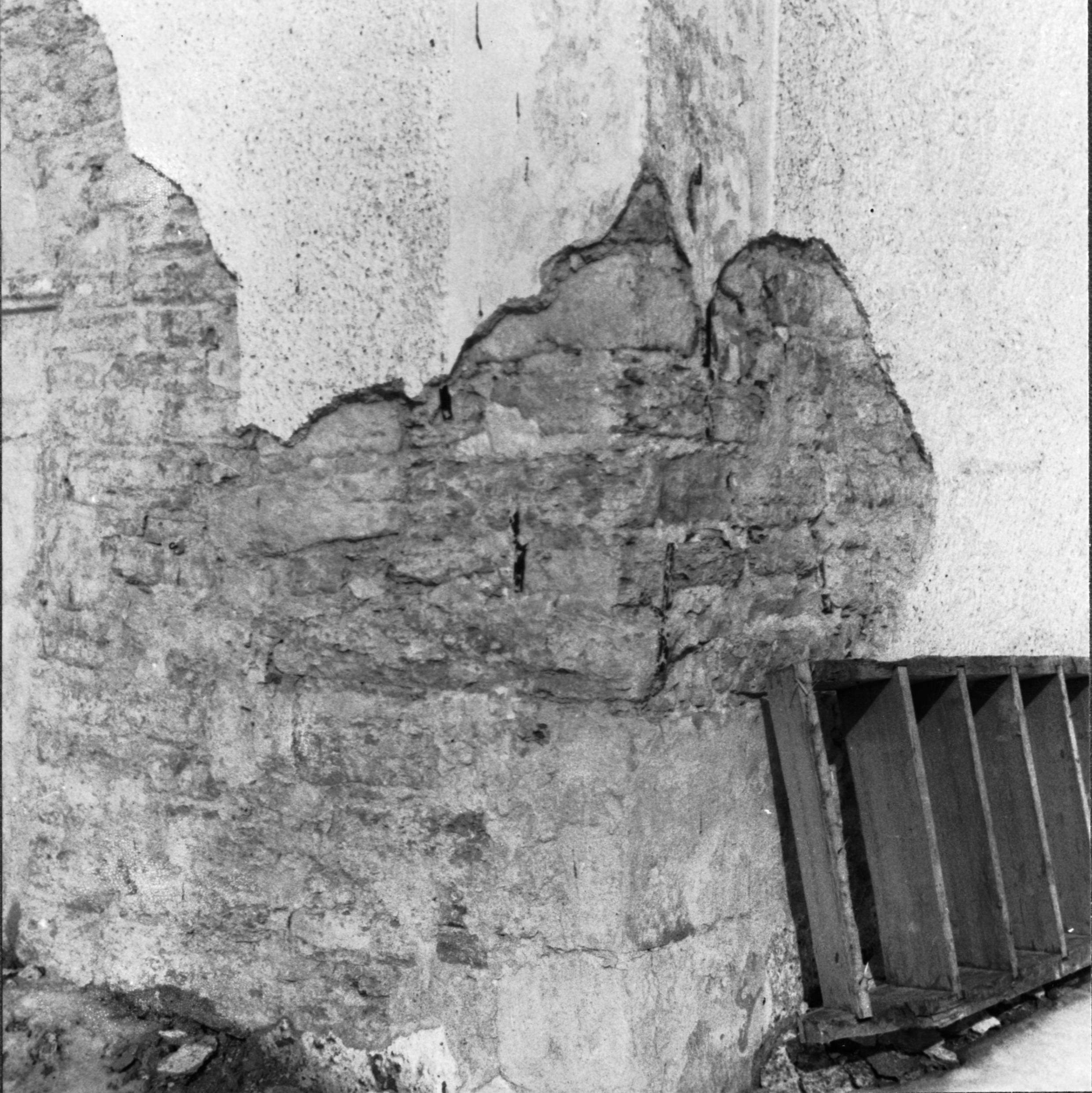 Tornets sydvästra hörn med avknackad puts.