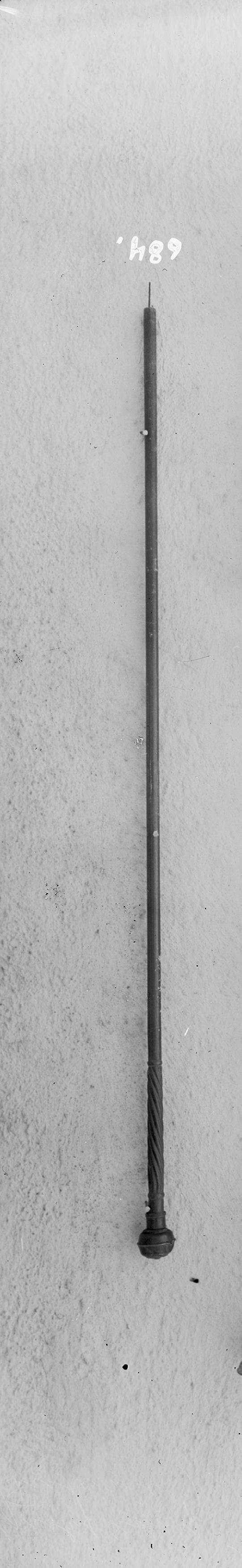 Kyrkstöt med rödmålat och svarvat träskaft.