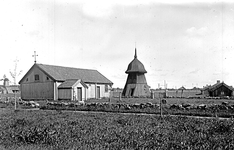 Vy från väster, med Vädersågen från Ekeskog, Härjevadskyrkan, Höjentorpsstugan och där bokom Händenestugan.