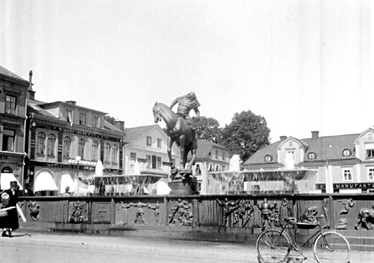 Fontänen Folkungabrunnen av Carl Milles på Stora torget i Linköping, invigd 12 december 1927. Folke Filbyter på häst. Enligt sägnerna stamfar till Bjälboätten och därmed Folkungaätten.