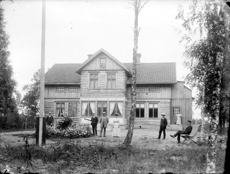 Stort trähus med egendomligt utbygge på högra gaveln.