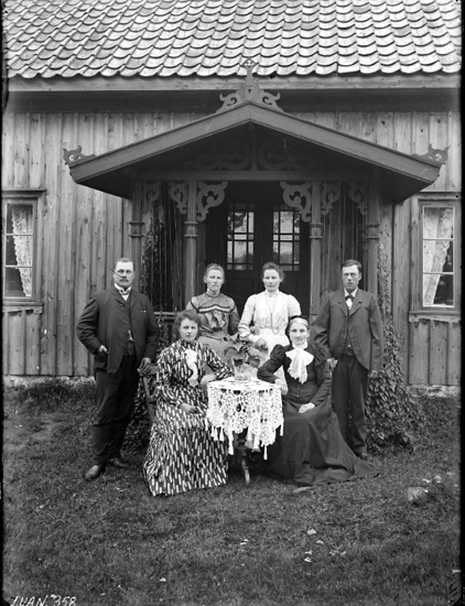 Fyra damer sittande vid bord flankerade av två herrar framför hus med veranda.