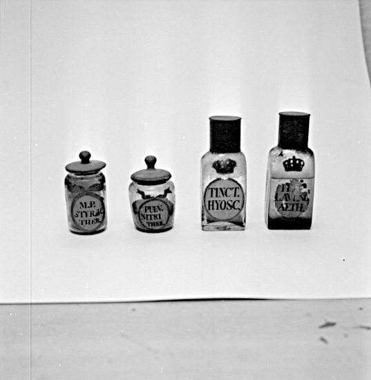 Skara. Veterinärinrättningen. Veterinärapotekets burkar.