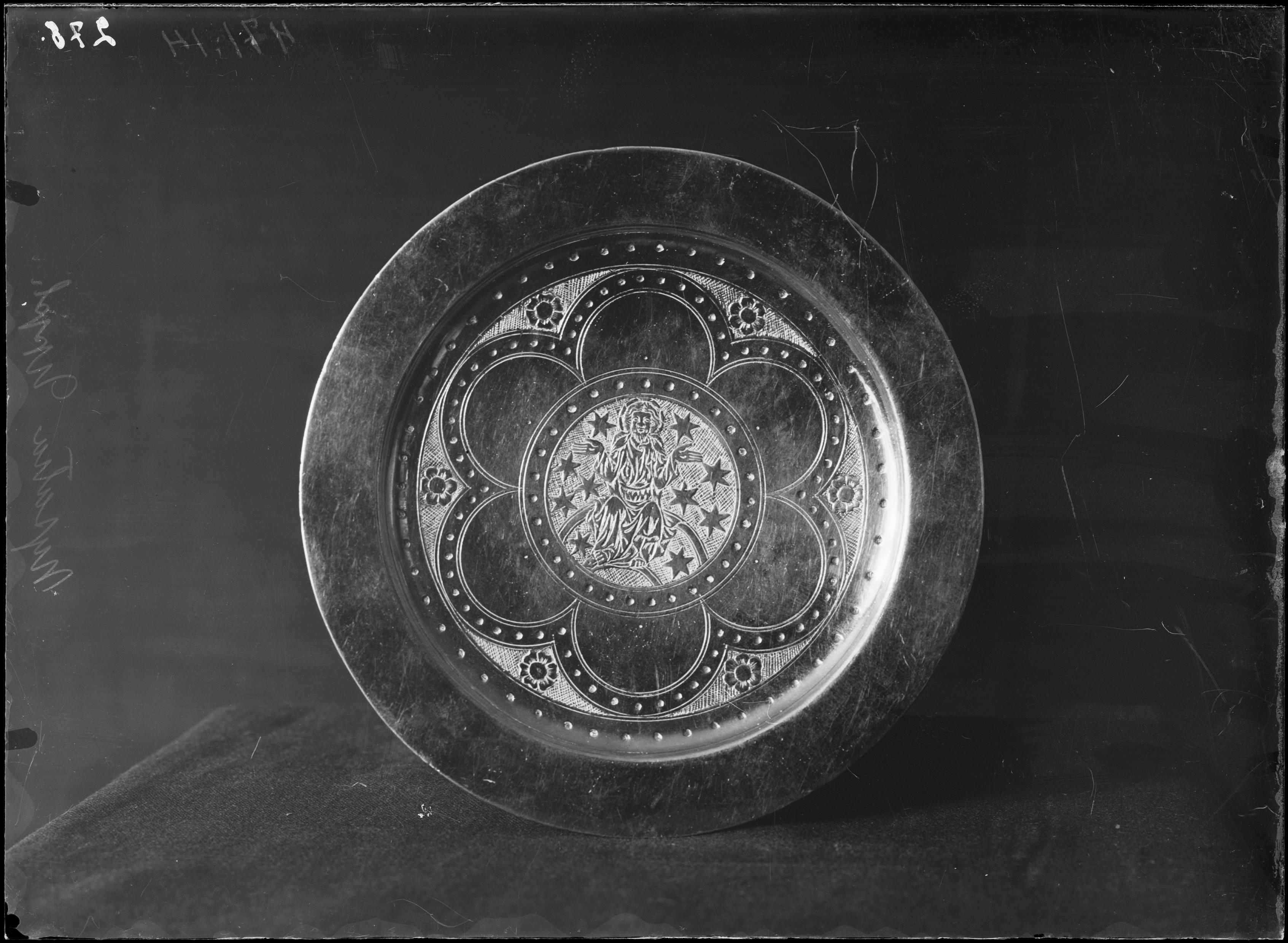 Patén, förgyllt silver, i mitten Kristus på regnbågen omgiven av stjärnor. 1300-talet.
