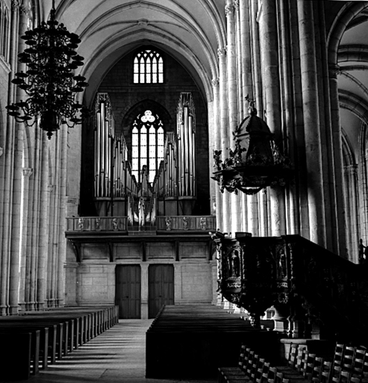 Titel: Skara. Domkyrkan, interiör mot orgelläktaren.