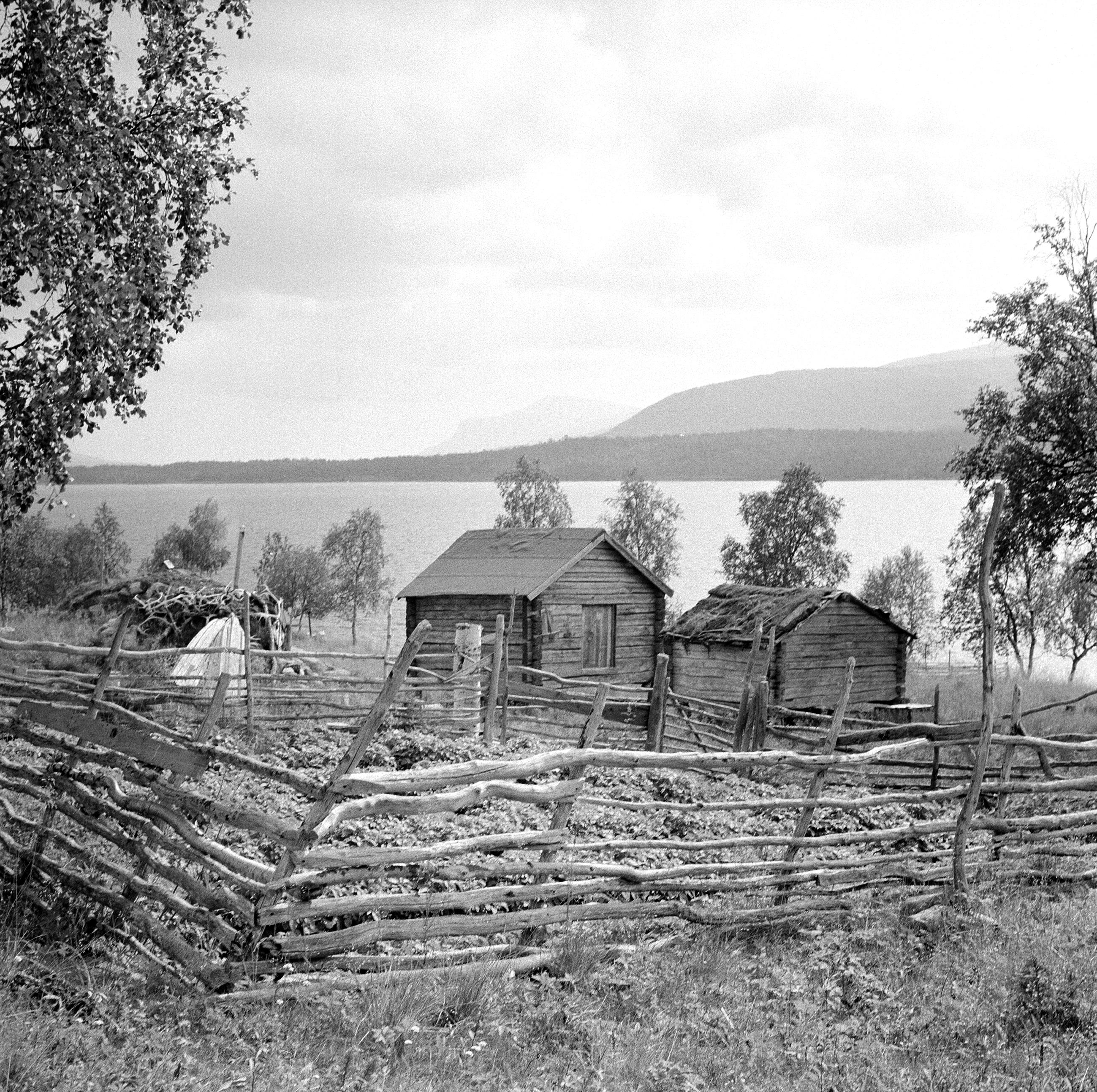 Timmerbyggnader och kåtor, de senare för getter, tillhörande Kruompa sameviste. I förgrunden inhägnat potatisland. I bakgrunden sjön Rebnisjaure, en av Skellefteälvens källsjöar. Foto mot SSO.