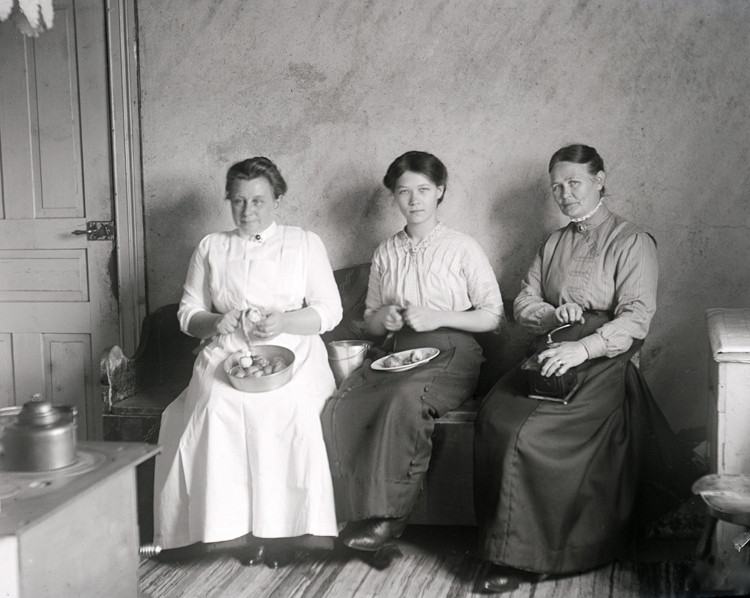 Tre kvinnor sysselsatta med att skala äpplen och mala kaffe.