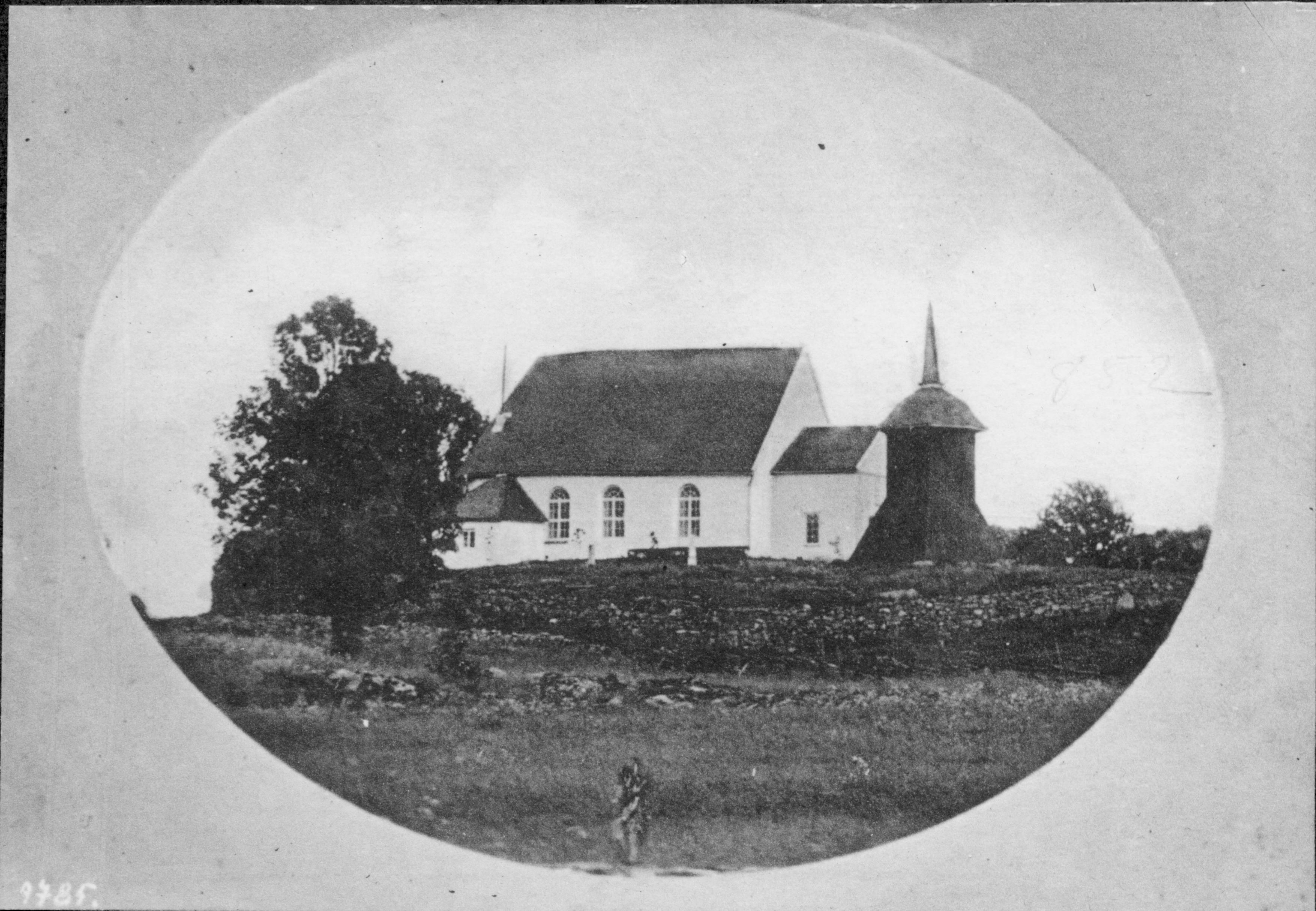 Kyrkan och klockstapeln från norr.