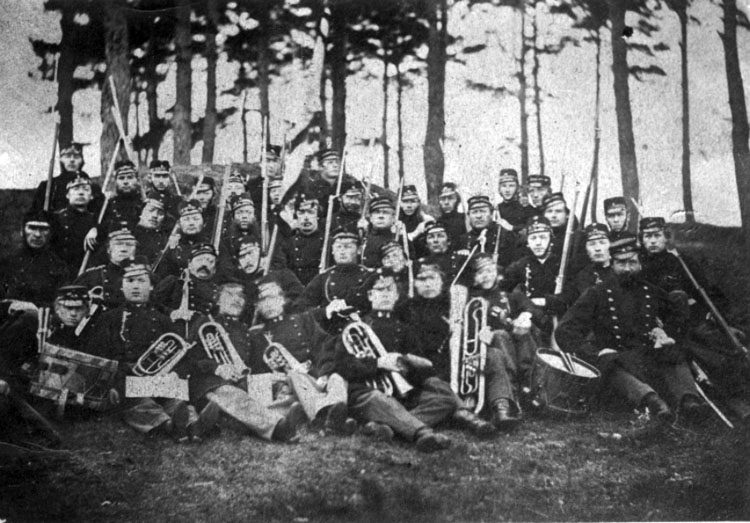 Lidköpings Skarpskyttar med sin musikkår, troligen år 1863.