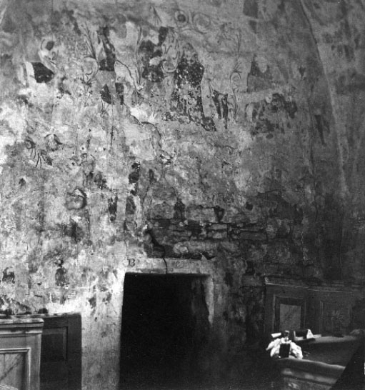 Österplana gamla kyrka, väggmålningar vid predikstolen.
