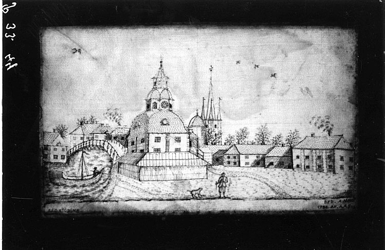 Foto av broderad tavla med Lidköpings Rådhus.