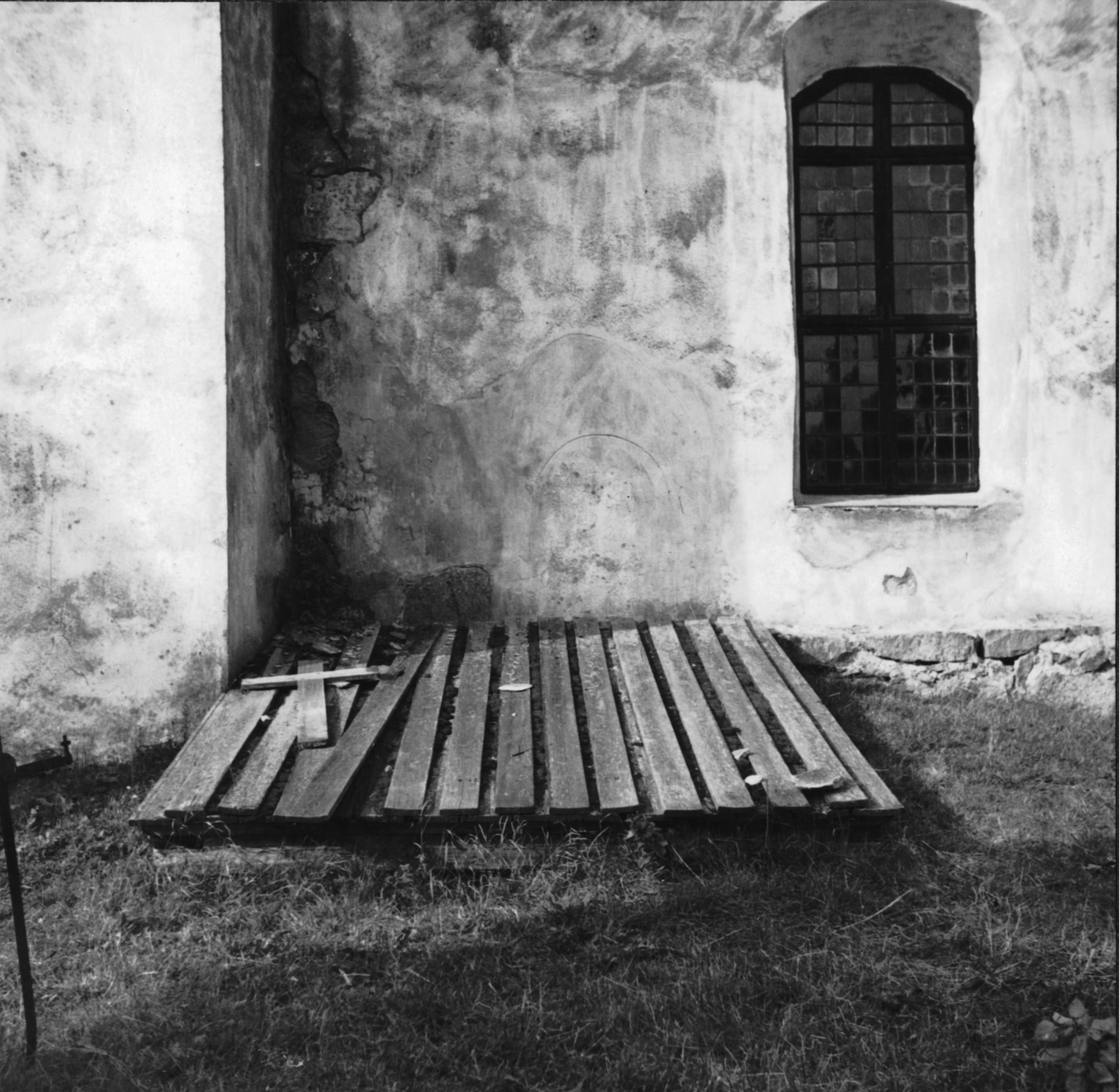 Gravkammare i hörnet mellan långhus och kor, igenfylld augusti 1949. Från söder.