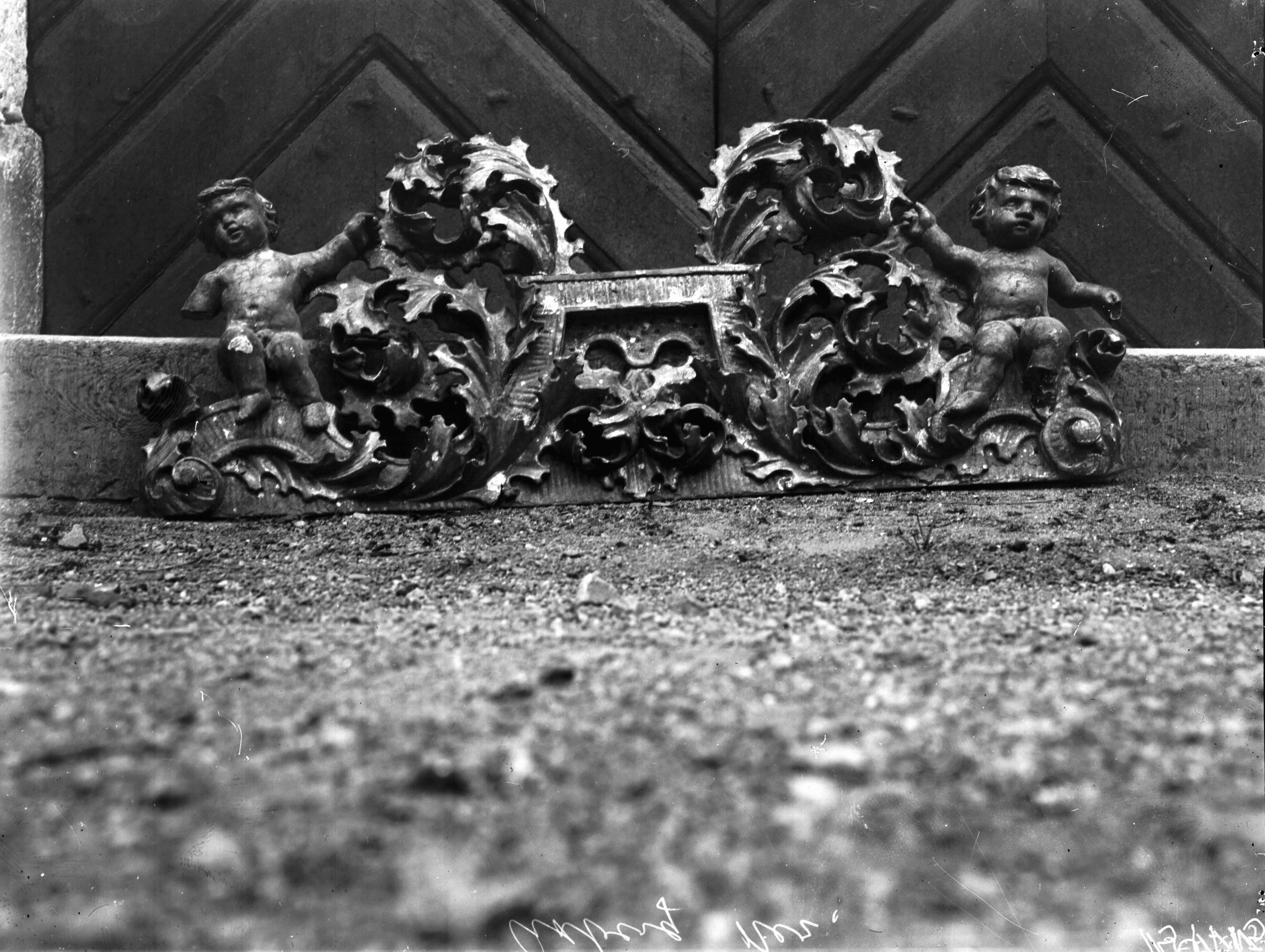 Krön av skulperat och förgyllt trä, lövverk och putti, 1600-talets slut eller 1700-talets början. Snabbinv.