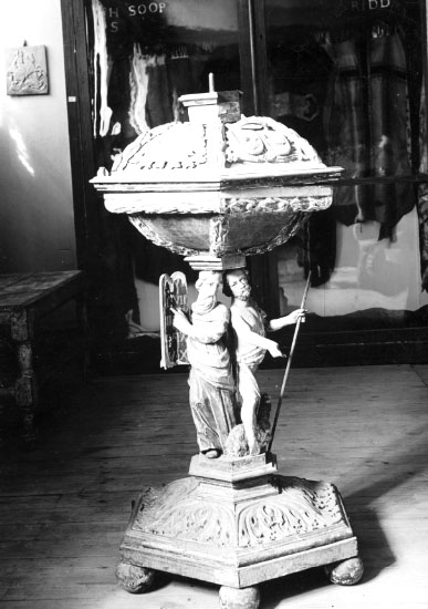 Dopfuntens stativ tillverkad i trä (rikt utsirad) och dopskål i silver.