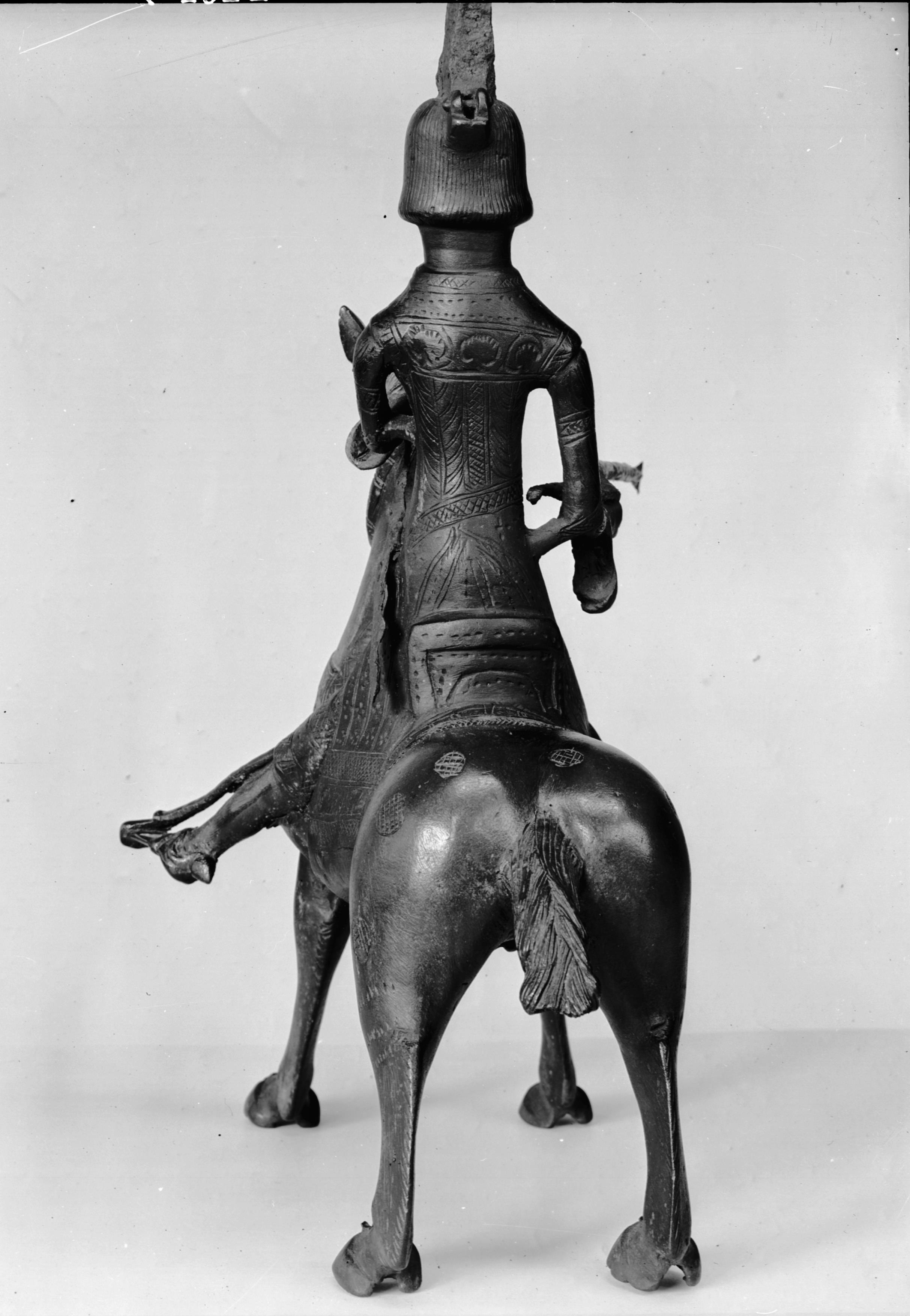 Akvamanile av brons, häst med ryttare, 1200-talet. Bakifrån.