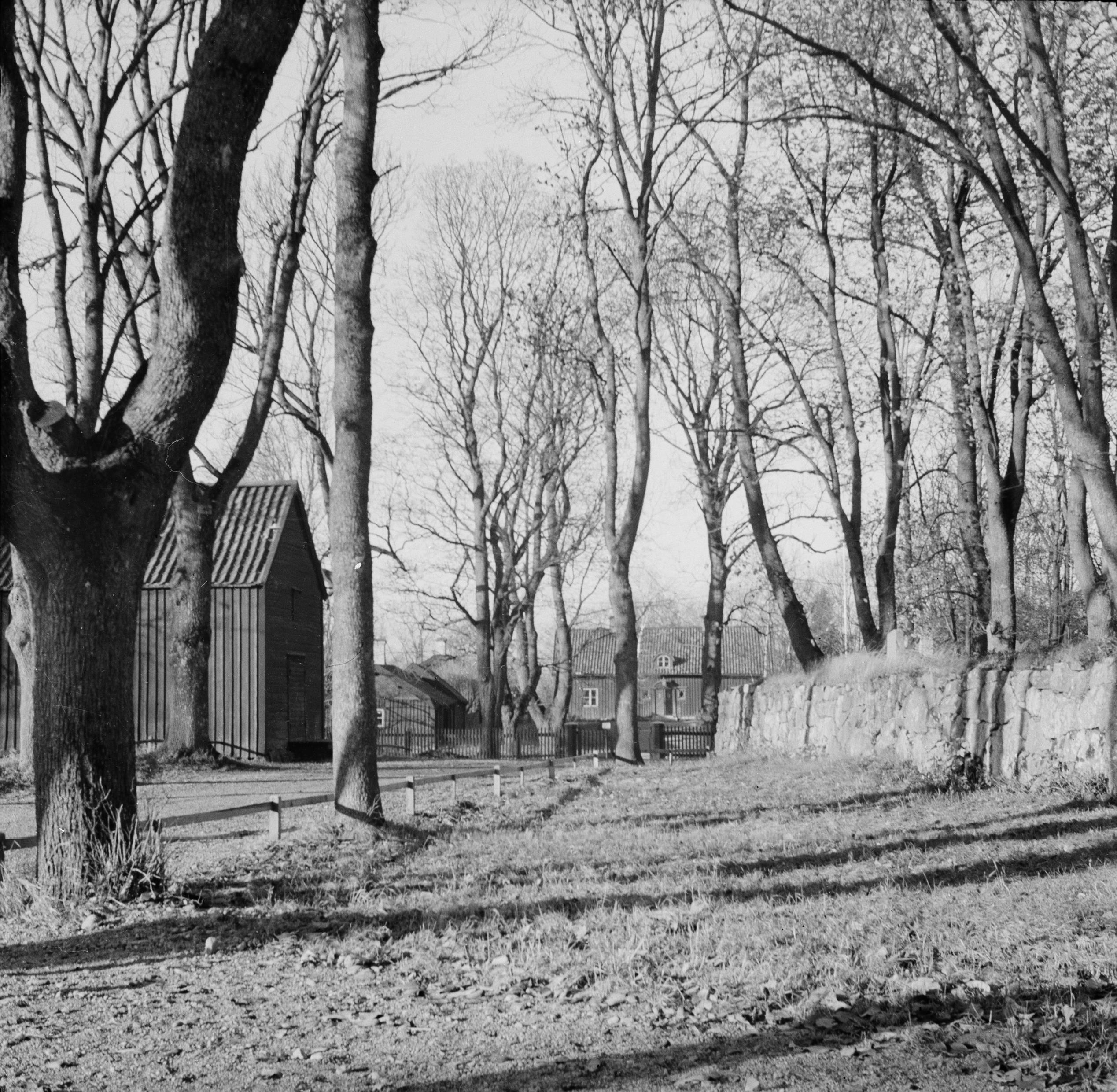 Del av kyrkogården med omgivande byggnader.