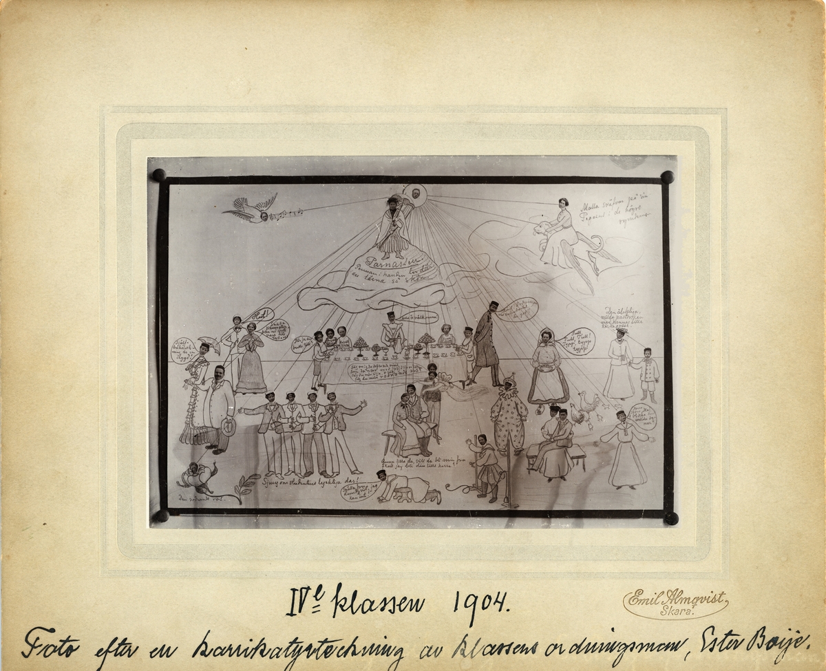 Karikatyrteckning av klass på Skara folkskoleseminarium.