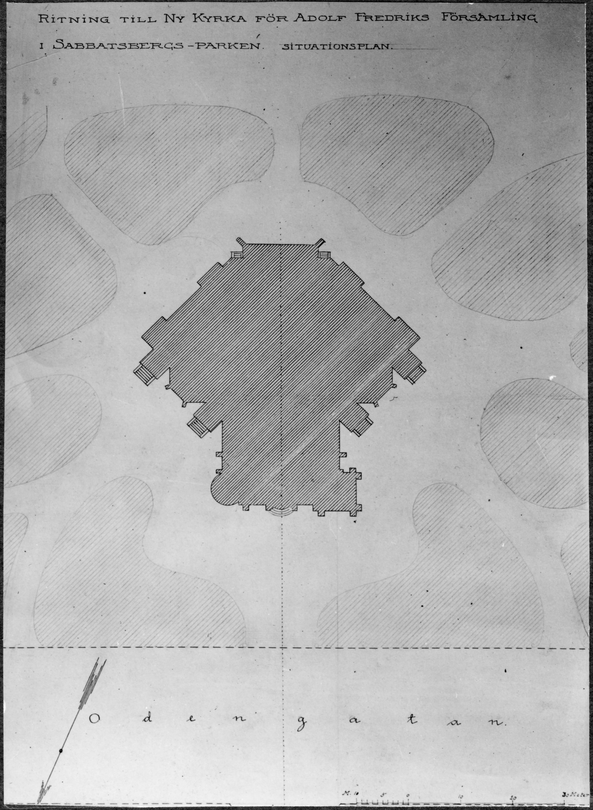 Förslag till kyrka för Gustav Vasa församling. Foto efter planritning av Fritz Eckert 1900, ur Adolf Fredriks kyrkas arkiv.