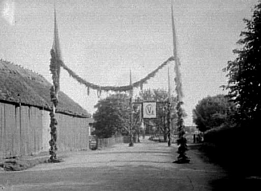 ÄREPORT MED KUNGENS MONOGRAM ÖVER VÄGEN I LYRESTAD VID KUNGABESÖKET.