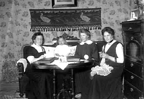 TRE KVINNOR OCH EN LITEN FLICKA I FINRUMMET, EN KVINNA VIRKAR.