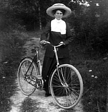 EN KVINNA STÅR PÅ EN VÄG MED SIN CYKEL