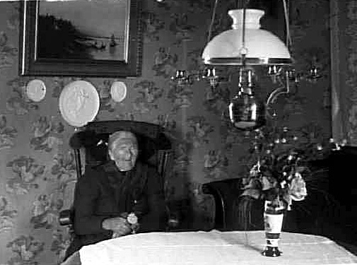 EN ÄLDRE KVINNA SITTANDE I EN GUNGSTOL.