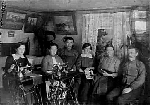 TVÅ KVINNOR SYR PÅ SYMASKINER. TVÅ KVINNOR HANDARBETAR. TVÅ MÄN SITTER BREDVID.
