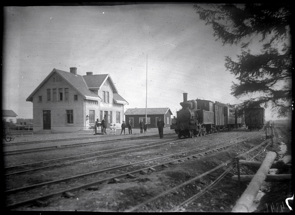 Torveds järnvägsstation med tåg och vagnar stående på spåret juni 1917