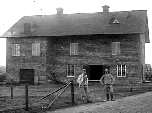 TVÅ MÄN FRAMFÖR EN TEGELBYGGNAD