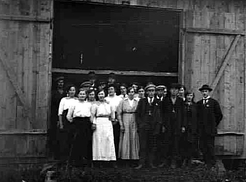 FLERA PERSONER SAMLADE I DÖRREN TILL EN LADA,KANSKE LOGDANS.