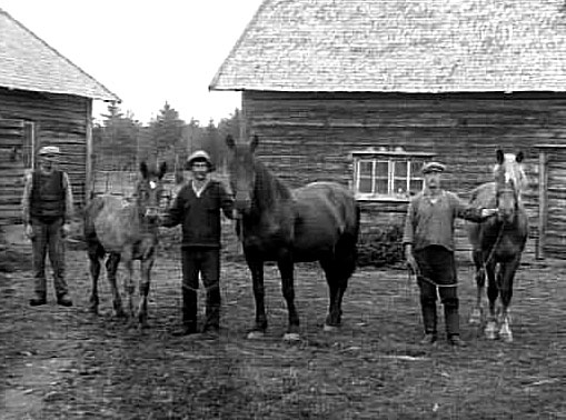 TRE MÄN HÅLLER HÄSTAR PÅ GÅRDSPLANEN INVID LADUGÅRDSHUSEN.