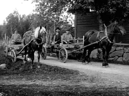 TVÅ HÄSTVAGNAR KOMMER ÅKANDE PÅ VÄGEN.