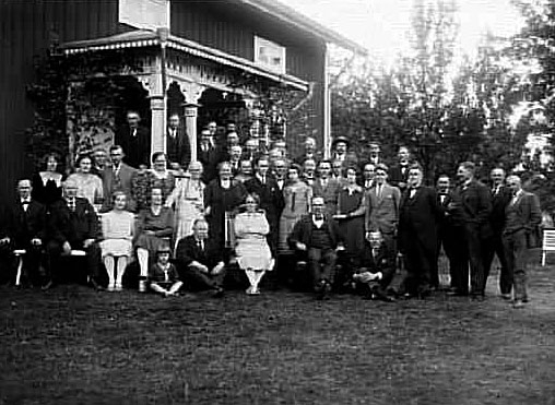 EN STOR GRUPP MÄNNISKOR FRAMFÖR ETT BOSTADSHUS KANSKE SLÄKTGRUPP
