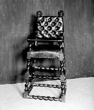 Skinnklädd barnstol med barnhuvud på ryggstödet.
