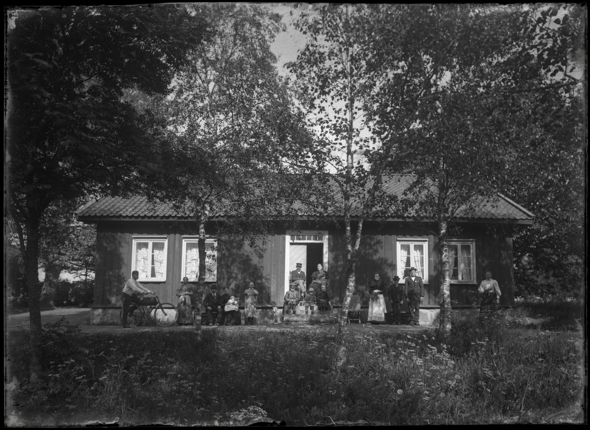 Familj samlad framför bostadshus
