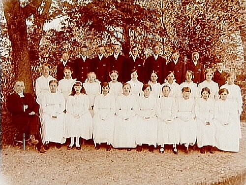 Konfirmander, 19 flickor, 9 pojkar och prästen.