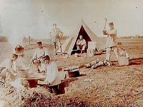 Kungliga Svea Trängkår, sex soldater vid tälten.