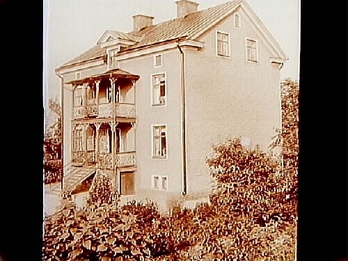 Tvåvånings bostadshus med balkong och förstubro i snickarglädje, takhuv.