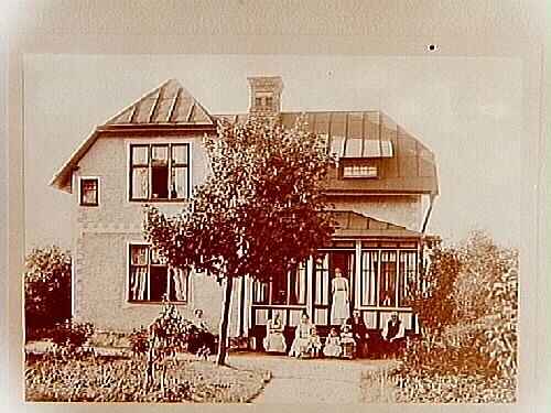 En och en halvvånings bostadshus med glasad veranda, 8 personer på trappan.