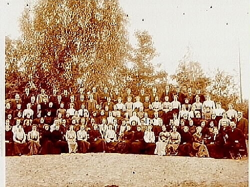 Gruppbild, flera personer, några av dem med musikinstrument.