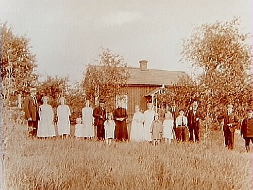 Envånings parstuga med förstubro med snickarglädje. 17 personer framför stugan.