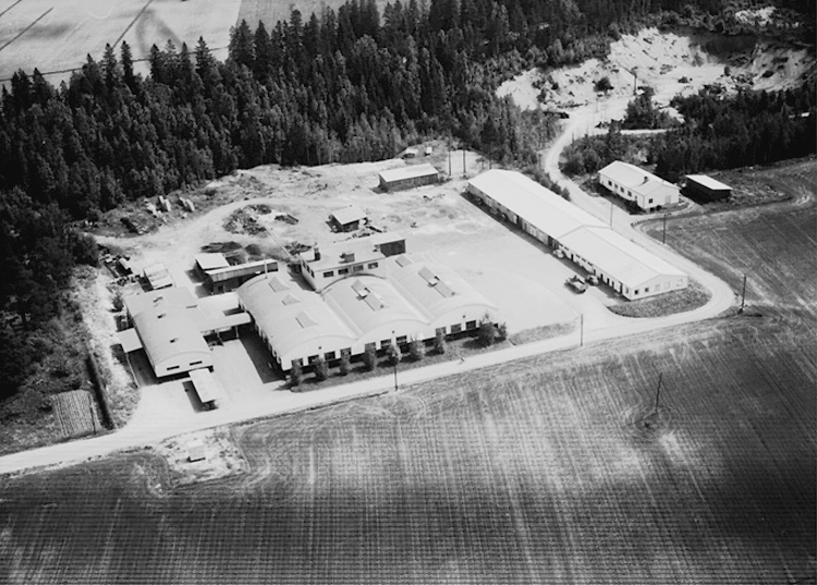 Flygfoto över Pålsboda, bostadshus och fabriksbyggnader.
