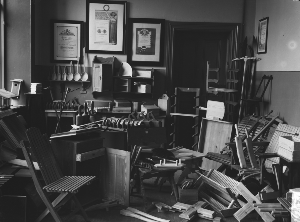 Dövstumskolan, interiör, elevarbeten i trä.